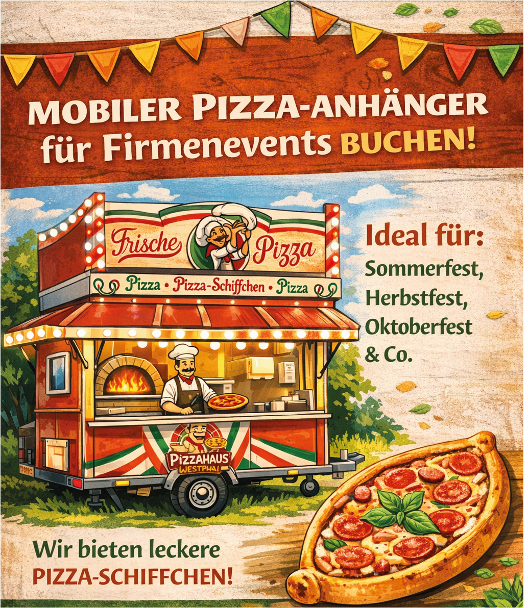 Mit unserem mobilen Pizzawagen Pizzahaus Westphal / Tradizione di Westphal bringen wir frisch gebackene Pizza direkt zu Ihrem Firmenevent. Ob Firmenfeier, Sommerfest, Messe oder Jubiläum – wir sorgen für einen zuverlässigen Ablauf und höchsten Genuss.